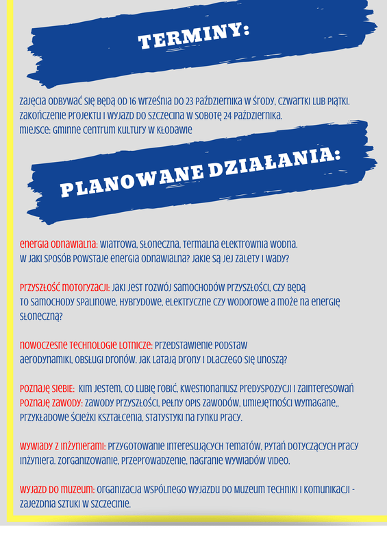 – nowoczesne technologie lotnicze – drony, przedstawienie podstaw aerodynamiki, obsługi dronów oraz jak latają drony i dlaczego się unoszą, czy to jest przyszłość komunikacji;